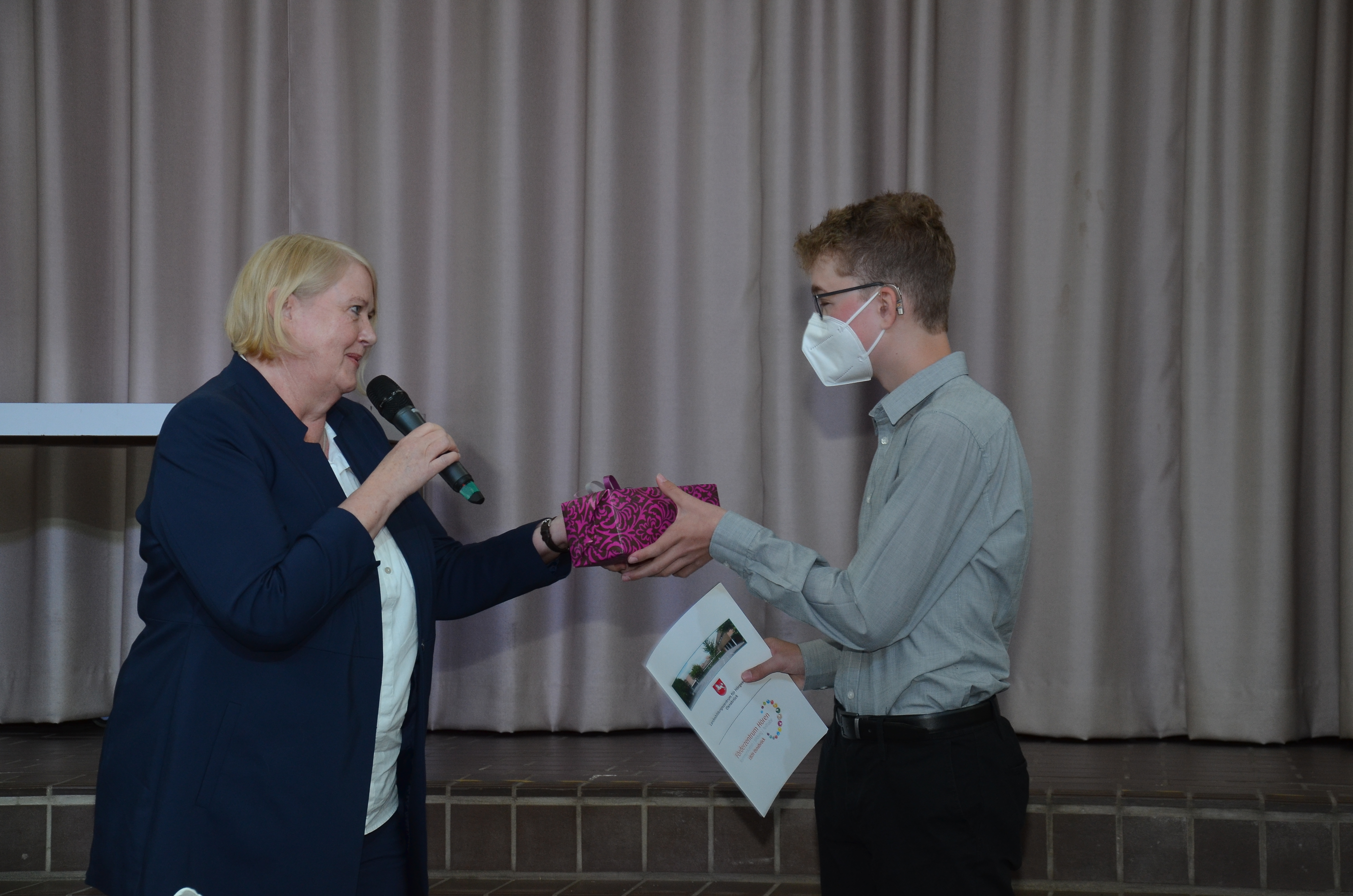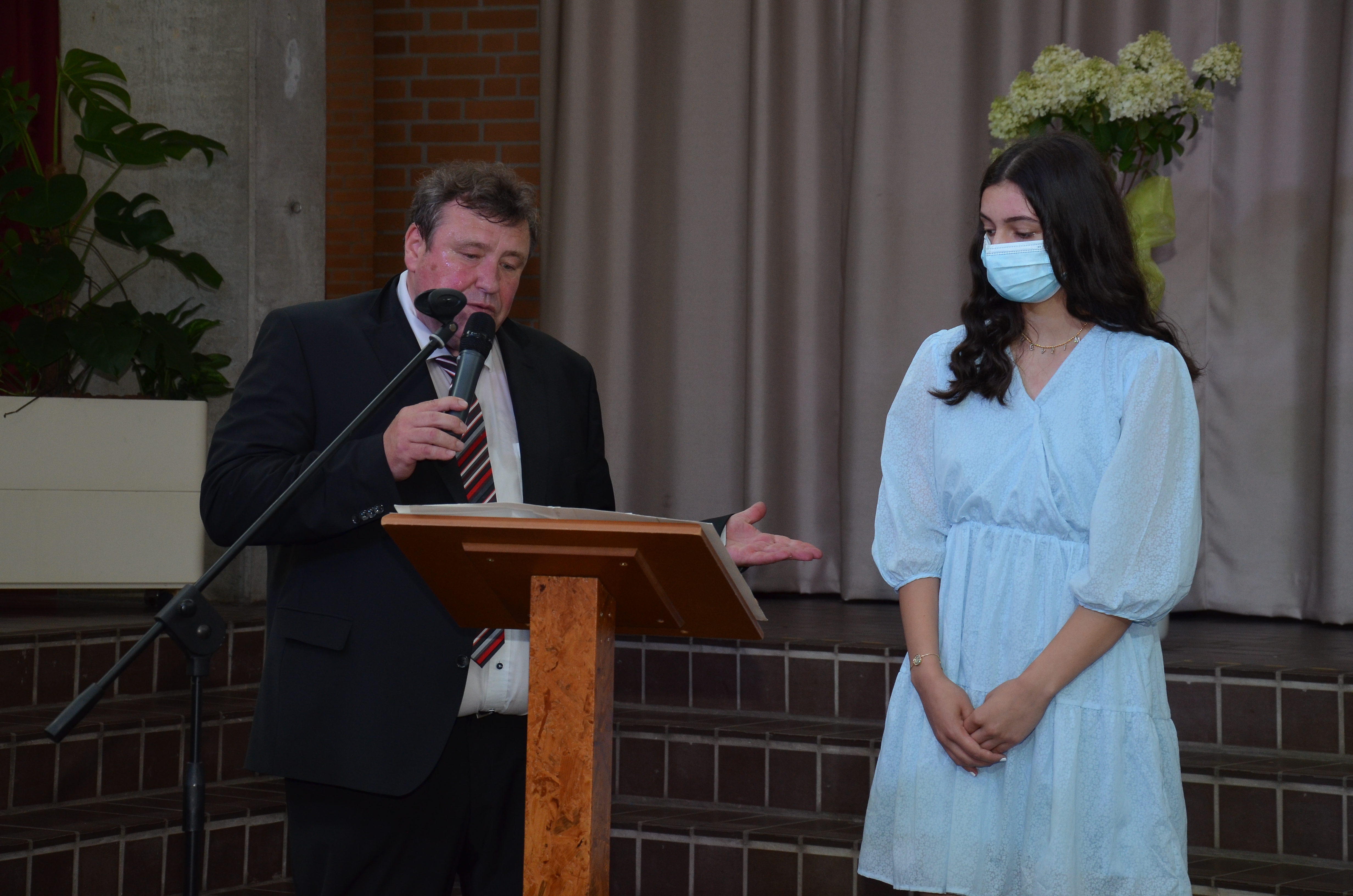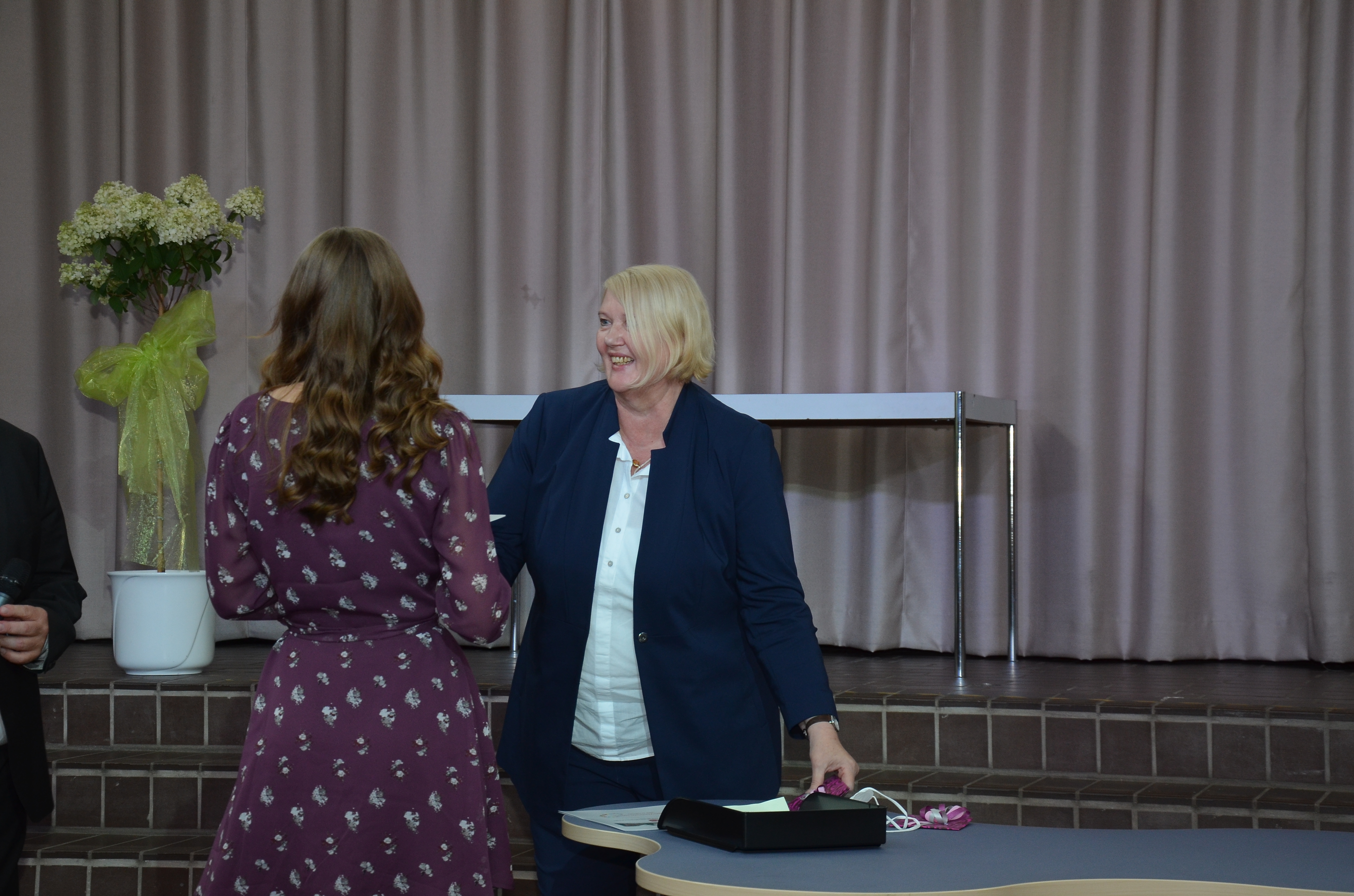 Devrim erhält vom Direktor Christoph Plickert eine Auszeichnung für ihr besonderes schulisches Engagement