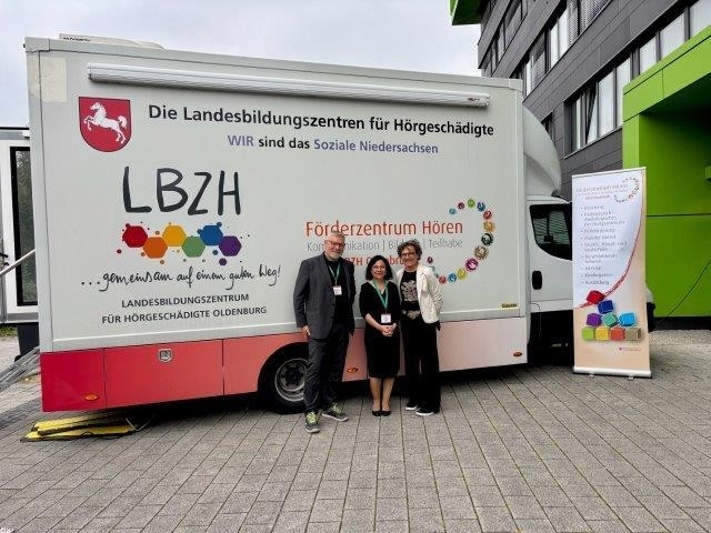 im Rahmen der Jahrestagung der Deutschen Gesellschaft für Phoniatrie & Pädaudiologie (DGPP) hat sich das LBZH Osnabrück mit Fachvorträge und dem Vorführen des Niedersächsischen Hörmobils beteiligt. Am Donnerstag führten Carsten Gregor und Dr. Markus Westerheide ein Tutorial zum Thema „Pädagogische Audiologie - Erfolgsfaktor interdisziplinäre Zusammenarbeit“ durch. Fachlicher Austausch und Wissentransfer prägten dieses Format, bei dem der Beitrag der Pädagogischen Audiologie – unter anderem im Rahmen der Arbeit am Audiologischen Zentrum des UKM Münster – anhand praktischem Beispiel erläutert wurde. Am Folgetag hatten die Tagungsteilnehmer die Gelegenheit das niedersächsische Hörmobil ‚live‘ zu erleben. Die Pädakustikerin & Meisterin des LBZH OS, Kerstin Bremken, zeigte Interessierten die vielfältigen Diagnostikoptionen, die mit dem Hörmobil möglich sind. Dieses Angebot wurde reichlich angenommen, dabei wurden der hohe technische Standard und die Einsatzkonzeption von vielen Seiten lobend hervorgehoben.